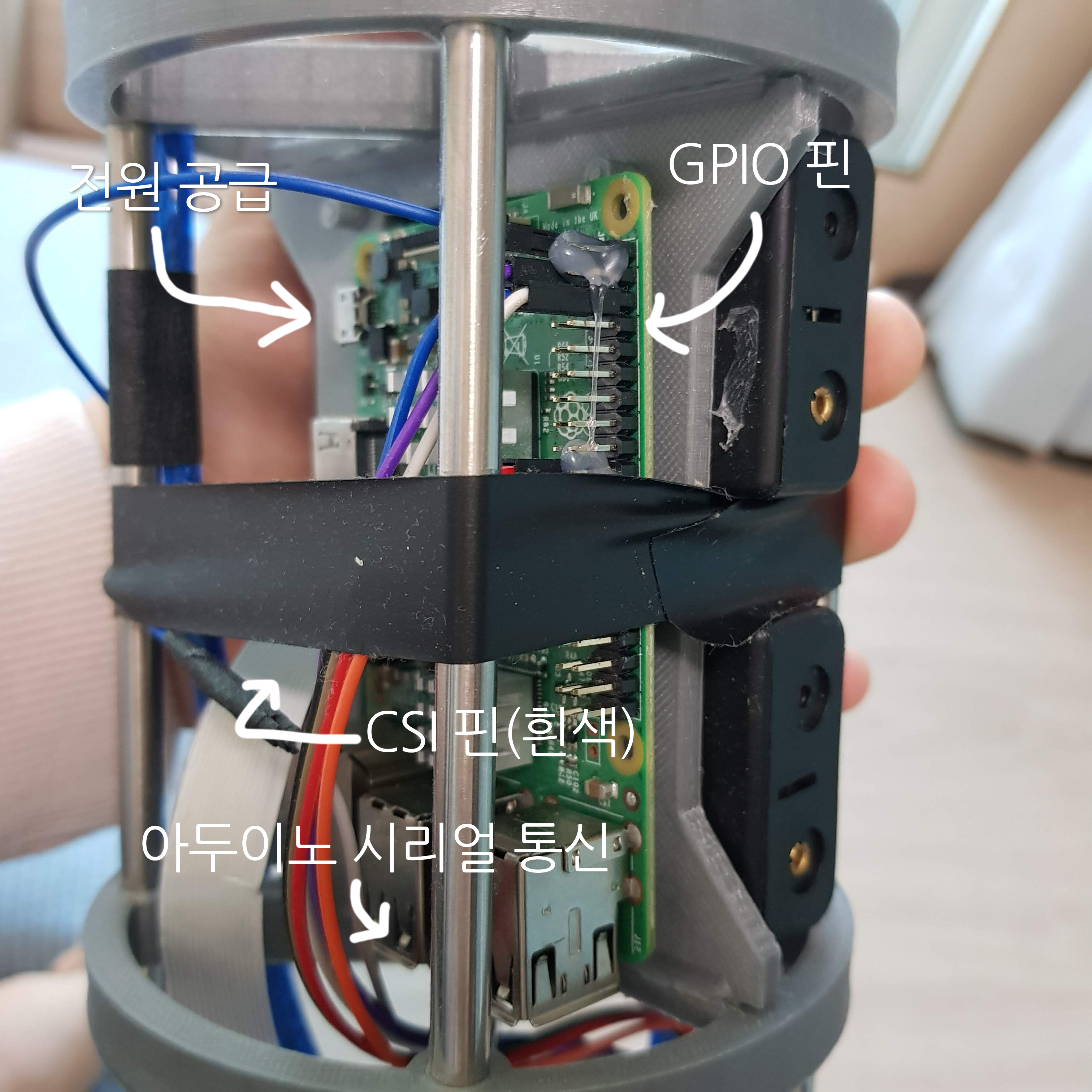 라즈베리 파이는 Far-IR 카메라 및 파이 카메라의 촬영 및 제어를 담당하고, 아두이노로부터 시리얼 통신 데이터를 받아 SD카드에 저장된다. GPIO핀으로 Far-IR 카메라와 SPI, I2C 통신을 하고, CSI 핀을 통해 파이 카메라와 통신한다. 두 카메라의 선은 30cm 이상 길어야 하는데, 짐벌과 라즈베리 파이의 위치가 상당히 떨어져 있기 때문이다. 코드는 data.txt파일에 시간, 사진 번호, 파이 카메라 노출값, 위도, 경도, 기압, 표면 온도, 흑체 온도를 저장하도록 했다. 각각의 값은 쉼표로 구분하고 사진이 찍힐 때마다 업데이트하여 줄 바꿈 하도록 했다. 이는 분석시 .csv파일로 변환하여 엑셀에서 여는 데 유리하게 해준다. 카메라는 pylepton 예제(FLIR | Lepton Sep 6, 2019)와 pi camera 라이브러리(Picamera Sep 6, 2019)를 사용했다.