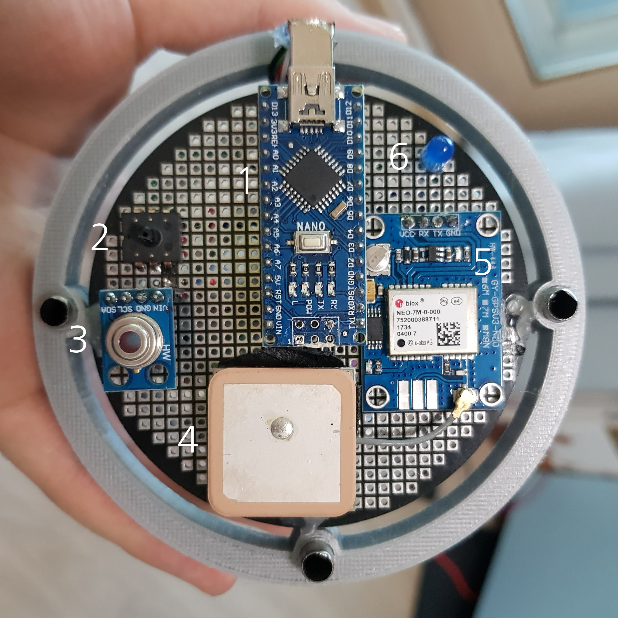 1번 레이어에는 그림 4와 같이 배치되었다. 반시계방향으로 아두이노 나노(1번), 기압 센서(2번), 무접촉식 온도 센서(3번), GPS(4번), GPS 통신 보드(5번), LED(6번)이다. 아두이노 나노는 과전류로 인한 손상의 위험이 있으므로 핀 헤더를 납땜하여 탈착할 수 있도록 했다. 기압 센서와 온도 센서, GPS의 좌표를 시리얼 모니터로 받아오도록 했으며, GPS의 작동을 확인하기 위해 위성에 연결되었을 경우 파란색 LED(6번)가 작동하도록 했다. 아두이노 나노의 시리얼 모니터값은 하단의 라즈베리 파이로 전송된다.