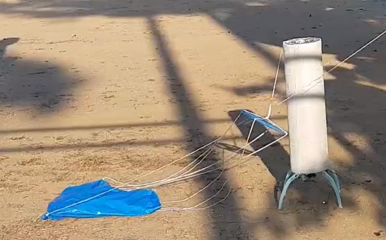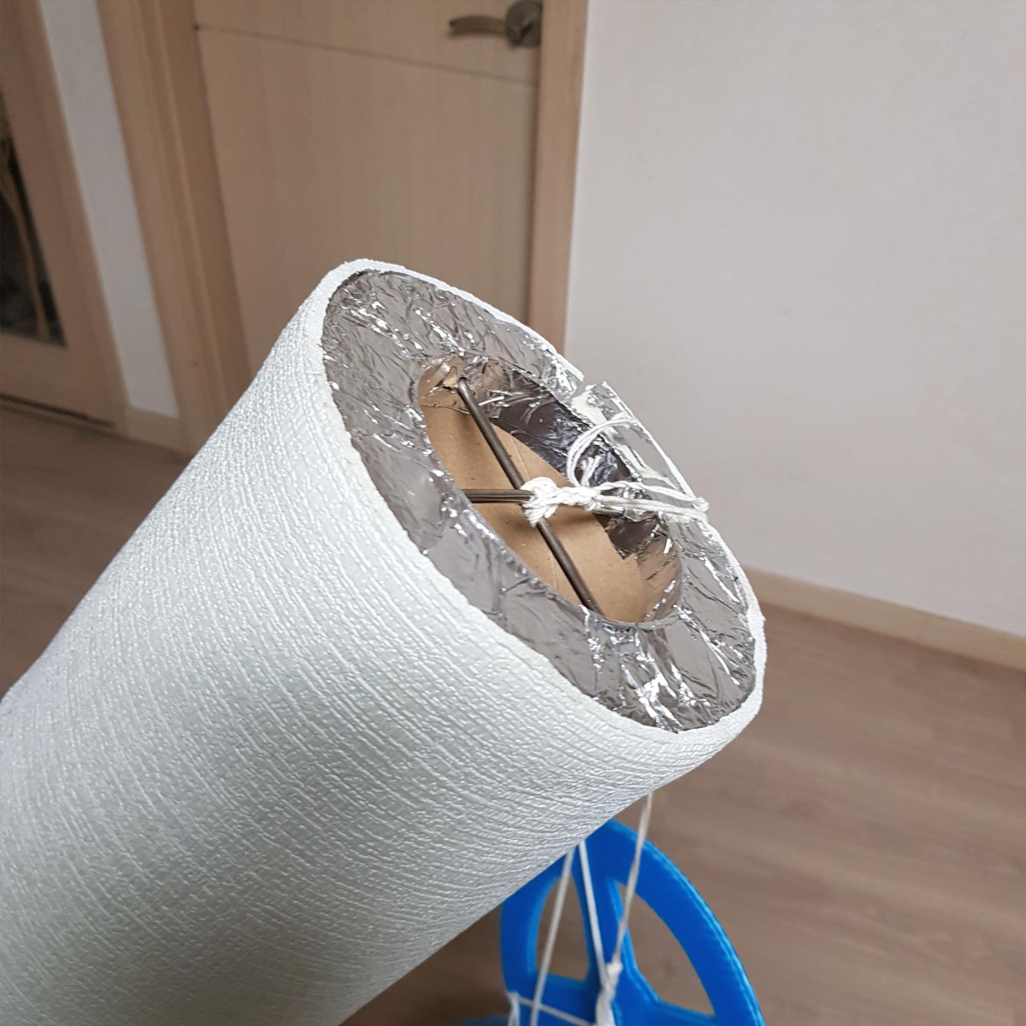 낙하산을 연결하기 위해서는 지관 상부에 구멍을 뚫고 지름 3mm의 과학상자용 철봉을 십자로 넣은 후 고무 패킹 처리를 하여 지관에 가해지는 압력을 줄였다. 보온재 상부를 알루미늄 테이프로 마무리했다.
