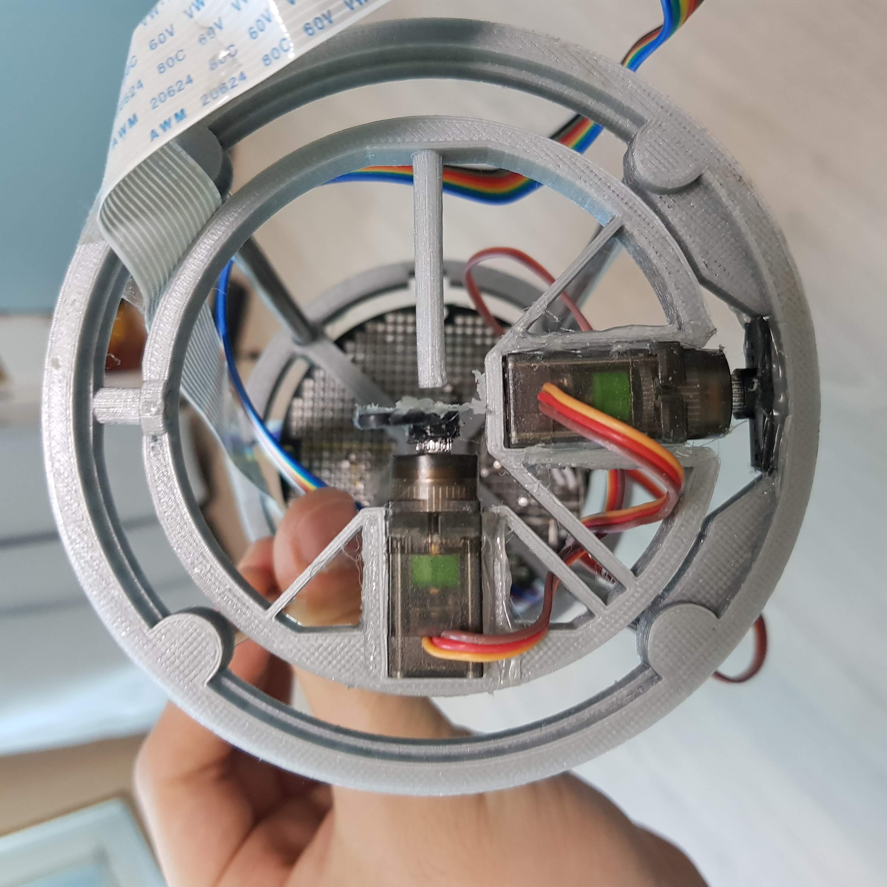 4번레이어에서 제어된 값을 서보모터에 입력한다. 그림 12에서는 서보모터가 제어하는 각 축을 보여준다. 사진상 가로로 고정된 모터는 내부 판에 고정되어 있어 외부 판을 돌리는 역할을 한다. 세로로 고정된 모터는 카메라를 고정하는 판을 회전시킨다. 그림은 수집 후의 모습이므로, 낙하 충격 때문에 파괴되어 떼어져 있는 상태이다.