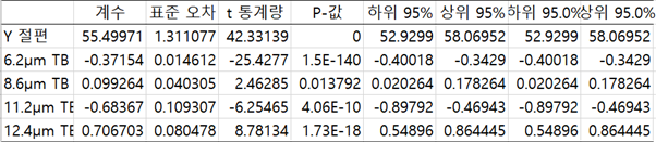 위 표는 4개의 밝기온도 값을 모두 독립변수로 설정해 분석한 값들이다. 각각의 독립변수에서 P-값을 비교해보면 모두 0.05보다 현저히 낮음을 볼 수 있어 모든 독립변수가 종속변수에 대해 유의하다는 걸 알 수 있다.