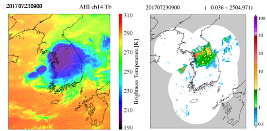 그림 4는 2017년 7월 23일 0900 KST의 Himawari-8 11.2 μm 밝기온도와 레이더 강수를 나타낸다.Himawari-8 위성을 통하여 관찰했을 때 밝기온도가 주변보다 낮은 지역에 강수가 내렸음을 확인할 수 있다. 이를 이용하여 강수량 분석을 진행하였다.