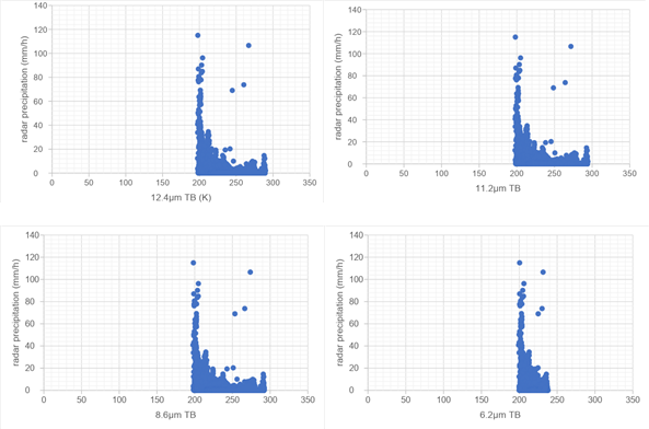 우리나라의 강수량을 추정하고자 하는 연구 목적에 맞게 16개의 채널 중 수증기 흡수가 일어나는 6.2 ㎛, 구름의 상(물인지 얼음인지)을 구분하는데 널리 쓰이는 8.6 ㎛, 대기창 영역인 11.2 ㎛, 12.4 ㎛ 파장에서 측정한 밝기온도 자료를 이용했다[2].