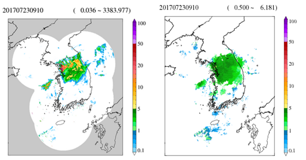 각 레이더 관측소에서 생산된 자료들은 강수대의 이동 및 변화 경향에 대한 중요한 정보를 제공해 주지만, 관측영역이 레이더 관측소 주변 지역으로 한정되어 있기 때문에 한반도 전체의 기상상태를 한눈에 볼 수 있는 영상자료는 제공해 주지 못한다. 그래서 우리는 위도는 31-39도 사이, 경도는 122-132도 사이의 한반도 주변으로 공간을 선택했다. 자료의 관측일자는 강수량이 많았던 2017년 7월 23일 0900 KST를 선택했다.