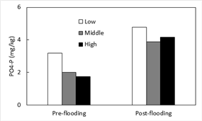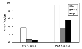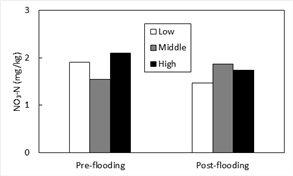 NO₃-N농도는 대체적으로 모두 비슷한 값을 가졌지만 NH₄-N농도는 Pre-flooding 때 Low에서 High로 갈 수록 낮아지는 경향을 보였고 Post-flooding에서는 Low-High-Middle 순으로 낮아지는 것을 알 수 있었다. 하지만 Pre-flloding 때와 Post-flooding 때를 비교해보면 NO₃-N농도는 많이 낮아지고 NH₄-N농도가 많이 높아지는 것을 볼 수 있었는데 이는 유기물이 미생물의 활동으로 암모늄태질소가 질산태질소로 가수분해된 것으로 보아 범람 후 미생물들이 더욱 활발하게 활동했다는 것을 알 수 있었다. PO₄-P농도는 Pre-flooding은 Low에서 High로 갈 수록 낮아지고 Post-flooding은 Low-High-Middle 순으로 낮아졌는데, 뿐만아니라 Pre-flooding에 비해 Post-flooding때 PO₄-P농도가 전체적으로 증가함 또한 볼 수 있었다. 토양에 인산이 모자라면 질산태질소가 쌓이는데 현재 결과값으로 PO₄-P농도가 증가함에 따라 질산태질소가 쌓이지 않아 농도가 감소했음과도 연관지을 수 있었다.
