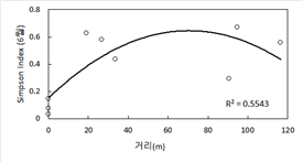 다음으로는 종의 구성과 그 수를 비교하여 분포와 다양성이 어떻게 변하였는지를 심슨 지수 (Simpson Index)를 이용해 구하였다.