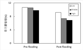 범람 후에 유기물함량은 Low, Middle, High에서 모두 감소하였으며, 수분함량은 Low, Middle에서 유기물함량의 감소를 따라 감소하였다.