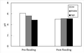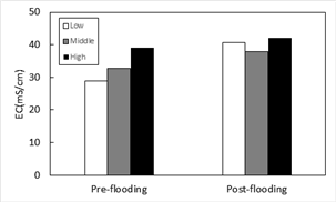 pH는 Pre-flooding 때 Low에서 High로 갈 수록 낮아지는 경향을 보였지만 Post-flooding 때는 이와는 반대로 High에서 Low로 갈 수록 낮아지는 경향을 보였다. EC는 Pre-flooding 때 고도가 높아질수록 커짐을 알 수 있었고, Post-flooding 때는 Middle-Low-High 순으로 전기전도도가 높아졌지만 전반적으로 비슷한 값을 갖고 있음을 알 수 있었다. Pre-flooding과 비교해보았을 때 Post-flooding의 EC값이 커졌는데 그 이유는 범람에 의해서 염, 이온물질, 총용존고형물(TDS, total dissolved solid)등이 쓸려내려왔기 때문으로 보았다.