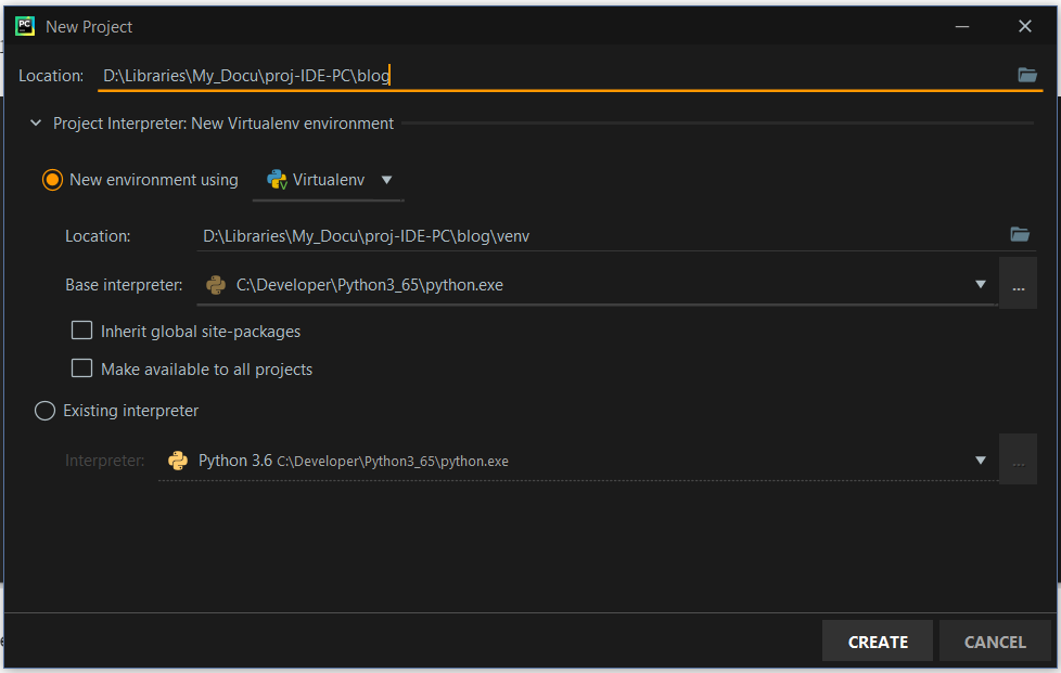 New environment에서는 워크스페이스 아래 venv 폴더에 새 환경을 만듭니다.