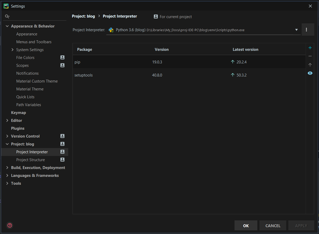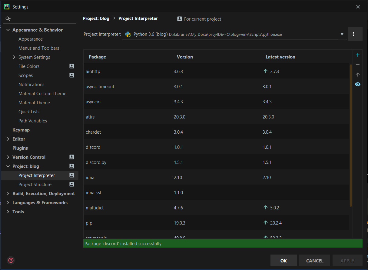 File > Settings > Project:Name > Project Interpreter 에 들어가면, 아까 만든 가상 환경에 설치되어있는 라이브러리 목록이 나옵니다. 옆의 + 버튼으로 discord와 asyncio를 추가해주면 됩니다. (하단의 install package)