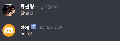 $hello라 입력하면 hello!로 답장하는걸 볼 수 있습니다.