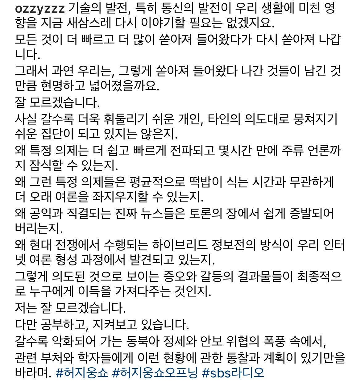 그런데도 우리는 타인의 삶에 관심을 둔다. 중독적으로 유튜브를 켠다. 운으로 부자가 된 사람을 부러워하고, 잘생긴 사람들이 연애를 시작하는 드라마를 보며, 인스타 핫플을 찾아다닌다. 환상에 중독될 뿐이다. 스크린 밖의 주변은 회색빛이 되어간다. 한 번은 인스타와 유튜브를 모두 끊어봤다. 일주일 동안은 마음에 허무함이 가시질 않았다. 그러나 시간이 갈수록 허무함은 사라지고, 내 주변에 집중하게 됐다. 그때 알았다. 중요한 것에 시간을 들여야 함에도, 양산형 미디어에 대부분의 시간을 쏟고 있었다.