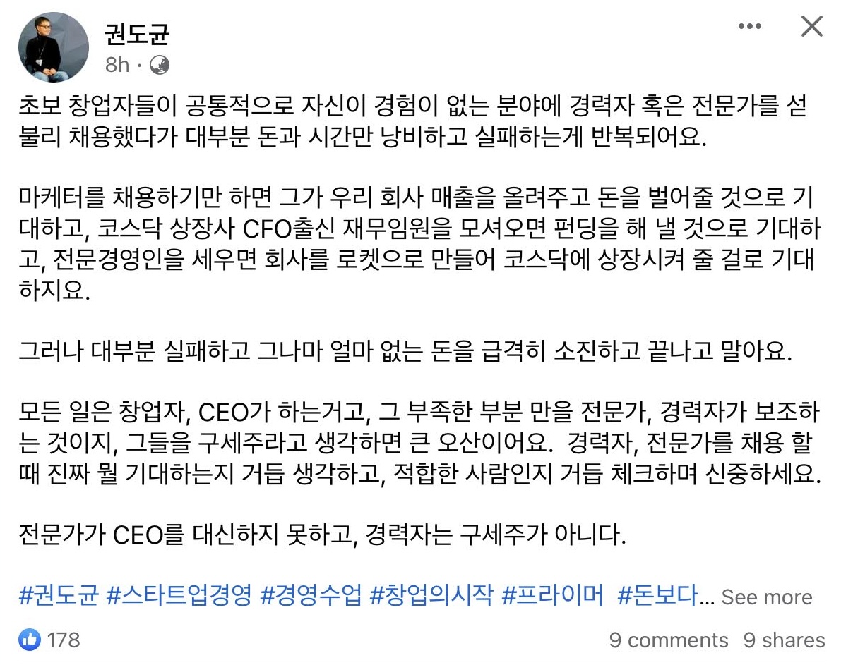 그 외에도 여러 가지 우여곡절이 있었다. 그러나 중요한 것은 잘하고 싶었던 마음이다. 나는 통과하지 못한 예창패를 통과한 기업에서 프로덕트를 만드는 것은 경험과 실력 면에서 좋은 기회였다. 내가 달랐으면 결과가 달라졌을까 싶기도 하다. 회사의 실세처럼 확실하게 이야기하고, 전문가의 입장에서 강경하게 대응했으면, 문제 상황을 더 조기에 발견하고 슬기롭게 해결할 수 있지 않았을까 싶다. 그러나 이 바램은 대표의 업무를 떠맡으려 한 내 오지랖임을, 권도균 대표의 페이스북 글을 보고 나중에야 알았다.